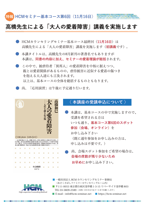 11月16日(日)基本コース第6回 スポット参加【会場・オンライン】の申込受付を開始しました。本講義では、高橋先生による「大人の愛着障害」講義を実施します(初講義です)。